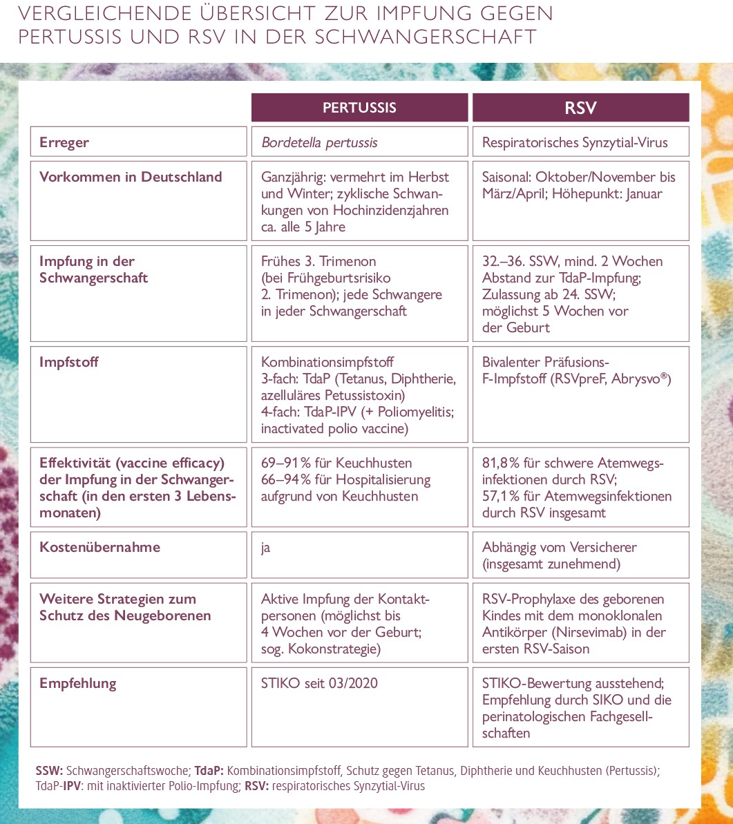 Insbesondere Atemwegsinfektionen durch das respiratorische Synzytial-Virus (RSV) und das Bakterium Bordetella pertussis (Keuchhusten) betreffen sowohl hinsichtlich der Inzidenz als auch der Erkrankungsschwere und ihrem Komplikationspotenzial neben den Menschen höheren Lebensalters insbesondere Neugeborene und Säuglinge. Um letztere ab Geburt besonders zu schützen, besteht für beide Infektionskrankheiten die Möglichkeit der aktiven Impfung in der Schwangerschaft. Außerdem existieren komplementäre oder kompetitive Konzepte wie die Pertussis-Impfung von Kontaktpersonen des Neugeborenen oder die RSV-Prophylaxe des geborenen Kindes in der ersten RSV-Saison. Nachfolgend werden die wichtigsten Aspekte für die Beratung zusammenfassend dargestellt.