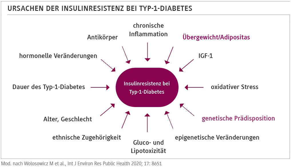 Für einen erhöhten Insulinbedarf gibt es keine einheitliche Definition, jedoch besteht eine gewisse Übereinkunft, dass mehr als eine Einheit Insulin pro Kilogramm Körpernormalgewicht bereits als Insulinresistenz gilt. Die persönliche klinische Erfahrung spricht für den pragmatischen Ansatz, dass mehr als 100 Einheiten Insulin pro Tag bei normokalorischer Ernährung sicher als Insulinresistenz angesehen werden können. Eine Metaanalyse aus 27 Studien mit mehr als 45 000 Teilnehmenden zeigt, dass rund ein Viertel der Menschen mit T1D im Verlauf ihres Lebens eine Insulinresistenz aufweisen, wobei der Anteil bei Frauen etwas höher liegt als der bei Männern [1].