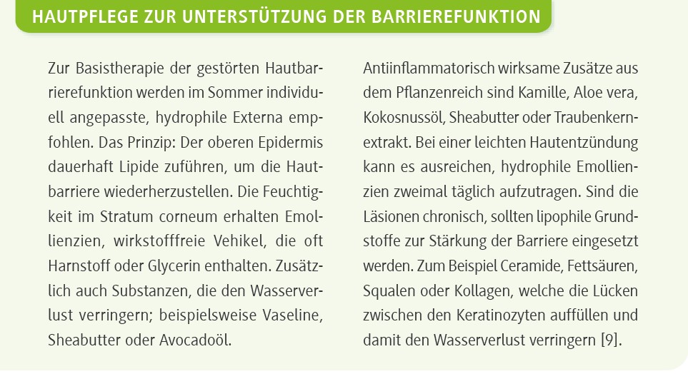 Auch wenn UV-Strahlen durch Glas, dicke Wolken und durch das Ozon der Stratosphäre gefiltert werden, essenziell ist die Prophylaxe: Strahlenexposition vermeiden, ebenso Allergene und Sonnenschutzmittel verwenden. Damit die Haut nicht austrocknet, hilft es, viel Wasser zu trinken und regelmäßig Feuchtigkeitscreme aufzutragen (Kasten).