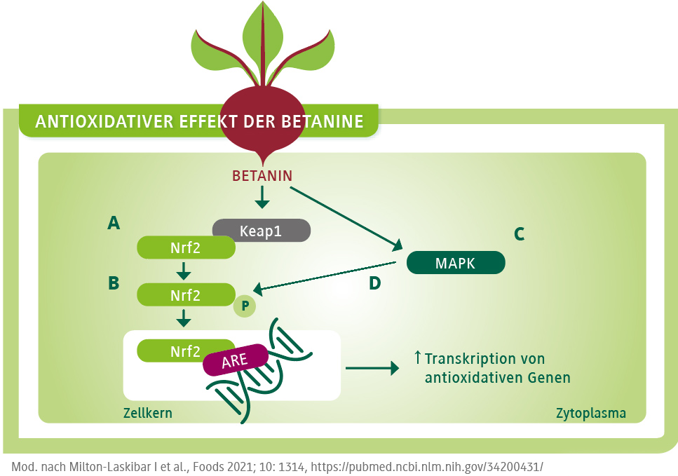 Betanine fördern den Zerfall des signalgebenden Nrf2-Keap1-Komplexes (A) und verstärken die Verlagerung von Nrf2, dem Transkriptionsfaktor gegen oxidativen Stress (B). Zusätzlich aktivieren sie die Mitogen-aktivierte Kinase MAPK (C), die im Gegenzug Nrf2 phosphoryliert und stabilisiert (D), was dessen Verlagerung in den Nukleus unterstützt. Nrf2 bindet an den Zellkern und die Transkription von Genen, die antioxidative Enzyme und solche der Phase II kodieren, nimmt zu. (ARE: antioxidant response element – eine regulatorische Sequenz in der Promotorregion von Genen)