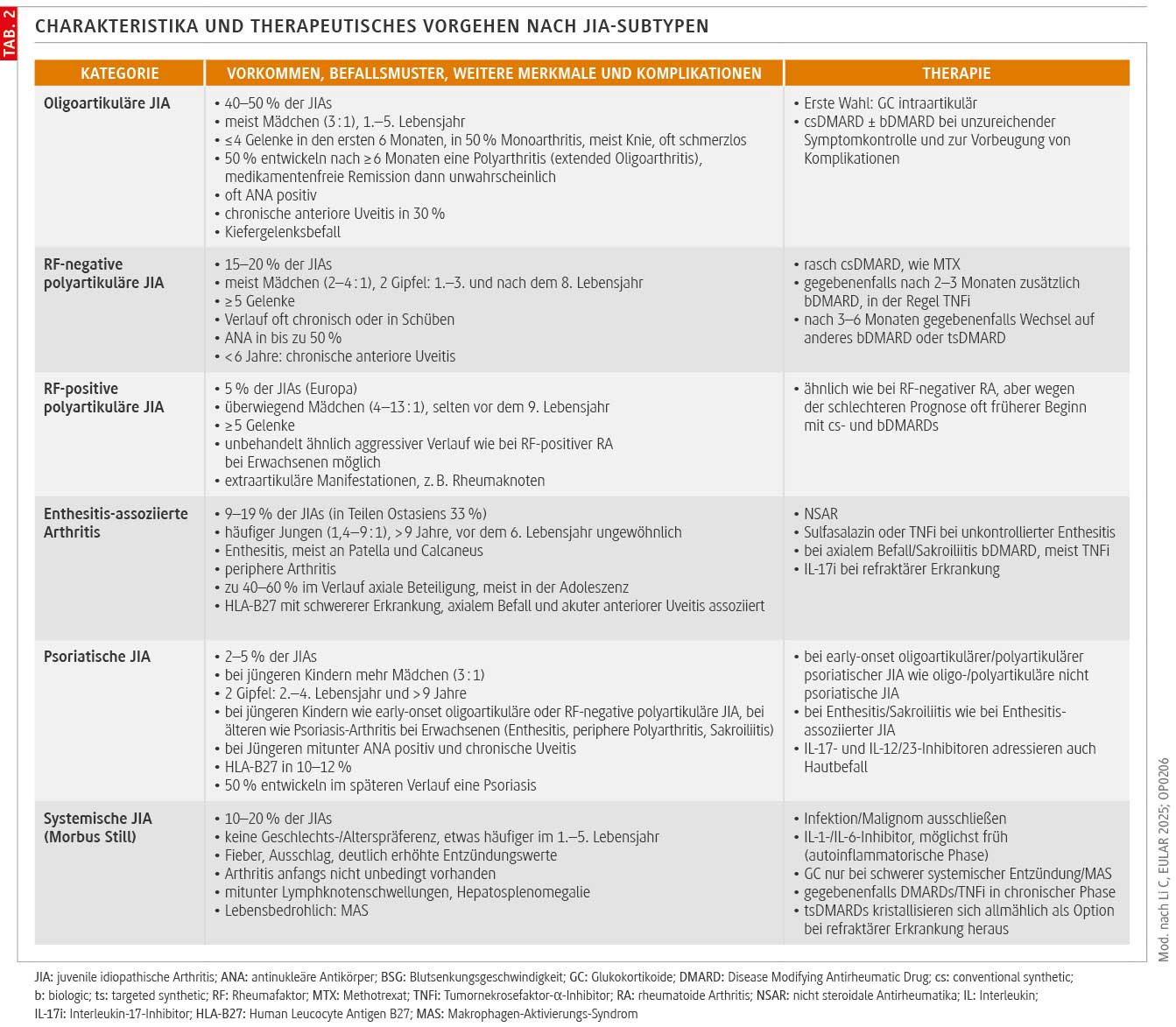 Generell richtet sich die Therapie nach dem JIA-Subtyp [5] (Tab. 2). Bis dato gilt die Klassifikation der International League Against Rheumatism (ILAR), die Paediatric Rheumatology International Trials Organisation (PRINTO) unterscheidet in einem neueren, noch nicht abschließend validierten Vorschlag nur noch sJIA, Rheumafaktor(RF)-positive JIA, Enthesitis/Spondylitis-assoziierte JIA, early-onset ANA(antinukleäre Antikörper)-positive JIA und andere. Damit soll die Therapie besser an Pathogenese und Prävention von Langzeitfolgen ausgerichtet werden [6].