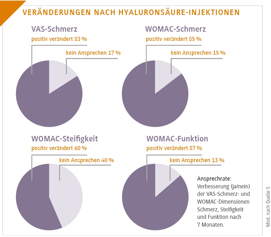 Hyaluronsäure (HA) ist eine wesentliche Komponente für die Struktur und Funktion von Synovialgelenken. Da degenerative und entzündliche Prozesse im Zuge einer Arthrose eine quantitative und qualitative Veränderung der endogenen HA-Konzentration und Struktur auslösen, wurde das therapeutische Konzept der Viskosupplementierung mit intraartikulären HA-Injektionen entwickelt. Im Zuge einer konservativen Arthrosetherapie können also bereits wenige Injektionen zur Schmerzlinderung beitragen und eine Besserung von Bewegungs-einschränkungen bewirken.