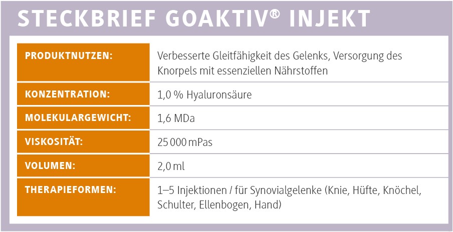 Ein bewährter Baustein der konservativen Arthrosetherapie ist darüber hinaus die intraartikuläre Injektion mit Hyaluronsäure (HA), beispielsweise mit der Fertigspritze GOaktiv® Injekt, die eine 1%ige Natriumhyaluronat-Lösung enthält (siehe Steckbrief).