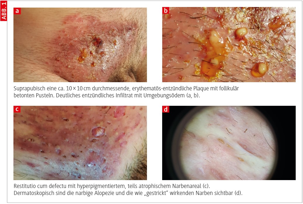 Klinisch: In der rechtsbetonten Schamhügelregion fand sich ein großflächiges, heftig entzündliches Infiltrat mit deutlicher Druckschmerzhaftigkeit (Abb. 1 a, b). Auch war eine rechtsbetonte, schmerzhafte inguinale Lymphknotenschwellung palpabel.