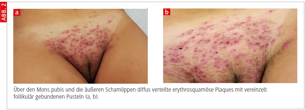 Etwa 6 Wochen nach Erstvorstellung des Patienten meldete sich dessen Partnerin mit progredienten entzündlichen Hautveränderungen, ebenfalls im Schambereich (Abb. 2). In der sofort durchgeführten PCR konnte der gleiche Erreger nachgewiesen werden. Durch den frühzeitigen Therapiebeginn mit Terbinafin systemisch und der Fixkombination aus Miconazol und Flupredniden lokal wurde nahezu eine Restitutio ad integrum mit nur geringer postinflammatorischer Hyperpigmentierung erzielt.