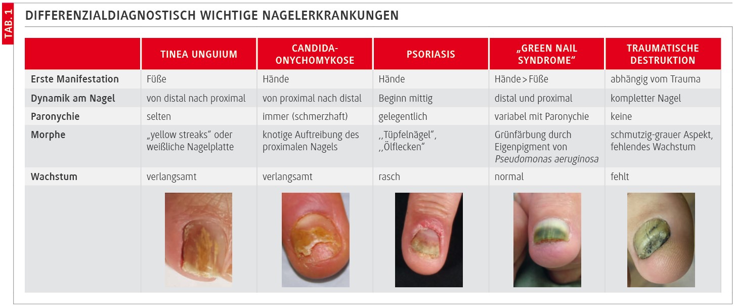 Eine Reihe von nicht-mykotischen Nagelerkrankungen können das Bild einer Onychomykose imitieren. Vor Beginn, insbesondere einer systemischen Nagelpilztherapie, sollte daher das Spektrum möglicher Differenzialdiagnosen bedacht und – wenn nötig – labordiagnostisch abgeklärt werden. Die wichtigsten Differenzialdiagnosen sind (Tab. 1):