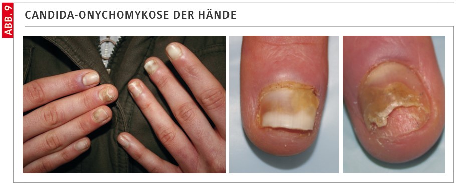 Hier besteht eine Infektion des Nagels und immer auch des Perionychiums durch Candida spp., zumeist Candida albicans, seltener mit den intrinsisch gegen Antimykotika resistenten Problemkeimen, Issatchenkia orientalis oder Candida glabrata. Die Candida-Onychomykose betrifft oft die Hände, da hier durch Bagatelltraumata und oftmals durch kontaminierende Maniküre (z. B. Zurückschieben der Nagelhäutchen) die Sprosspilze regelrecht inokuliert werden. Auch bei starker Immunsuppression tritt die Nagelcandidose auf. Die Infektion beginnt zumeist proximal und führt zu einer knotigen Austreibung dieses Nagelbereiches, zudem besteht eine meist heftig juckende und schmerzhafte Entzündung des Nagelwalles (Abb. 9).