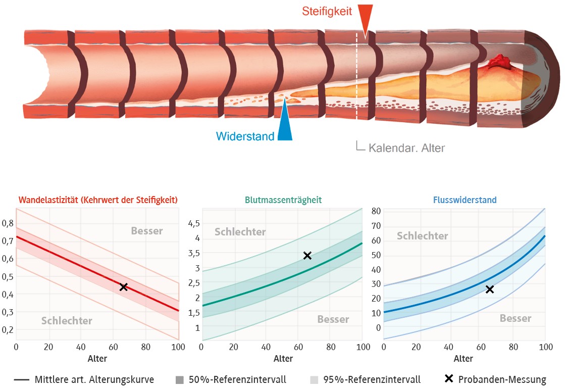 Die Validität oszillometrischer Mehrpunktmessungen zur Beurteilung vaskulärer Funktion wurde in klinischen Studien belegt. Der Ankle-Brachial-Index (ABI) zur Früherkennung von Durchblutungsstörungen, kombiniert mit intuitiv nachvollziehbaren Visualisierungen, besitzt einen hohen diagnostischen Wert und ist untersucherunabhängig einsetzbar [2]. Darüber hinaus konnte gezeigt werden, dass modellbasierte, nichtinvasive Abschätzungen des zentralen Blutdrucks invasiven Referenzmessungen mindestens ebenbürtig sind, auch bei Patienten mit Diabetes oder Arrhythmien [3].