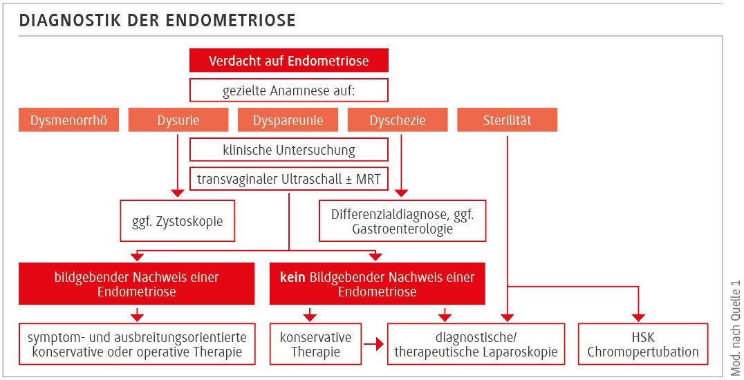 Ein MRT soll als Ergänzung in der Zweitlinie zum Einsatz kommen, wenn die Sonografie allein nicht ausreichend aussagekräftig ist. Die Laparoskopie wird weiterhin als diagnostisches/therapeutisches Instrument beschrieben, aber nicht mehr als primärer Goldstandard [1].