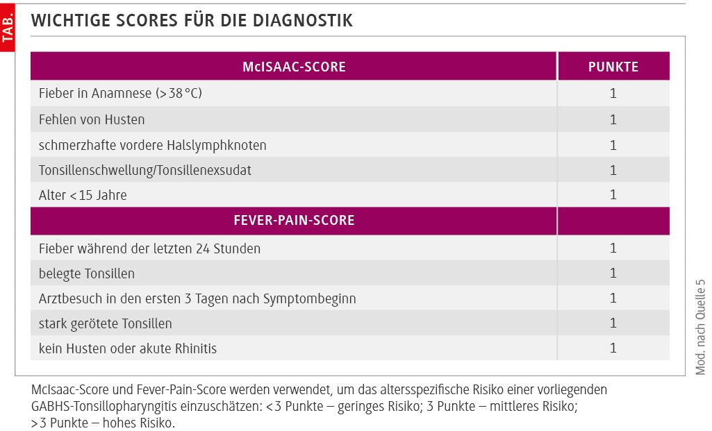 Für die Entscheidung, ob ein Antibiotikum verabreicht werden soll, ist die Unterscheidung zwischen einem viralen Infekt der oberen Atemwege und einer bakteriellen Tonsillopharyngitis (typischerweise durch Gruppe-A-β-hämolysierende Streptokokken, GABHS) relevant. Hierfür können klinische Scores herangezogen werden, für Kinder (ab 3 Jahren) und Jugendliche sind das vor allem der McIsaac-Score und der Fever-Pain-Score (siehe Tab.) [4,5]. Allerdings besteht bei Anwendung der Scores die Gefahr einer Übertherapie; sie sollen erst angewendet werden, wenn eine Antibiotikagabe erwogen wird. Der McIsaac-Score ist vor allem dazu geeignet, eine Streptokokken-Infektion auszuschließen, wenn der Score bei 0 liegt. Ähnliches gilt für den Streptokokken-Schnelltest. Dieser soll bei Kindern und Jugendlichen mit mindestens mittlerem Risiko für eine GABHS-Infektion (Score ≥ 3) angewendet werden, falls eine Antibiotikatherapie erwogen wird. Ein negativer Schnelltest sollte dann in der Regel (keine „Red Flags“, siehe unten) einen Verzicht auf eine Antibiotikatherapie begründen. Laborparameter wie CRP, BSG oder PCT ermöglichen keine sichere Unterscheidung zwischen viralen und GABHS-bedingten Halsschmerzen. Die Bestimmung des Antistreptolysin-Titers soll nicht durchgeführt werden [2,3].
